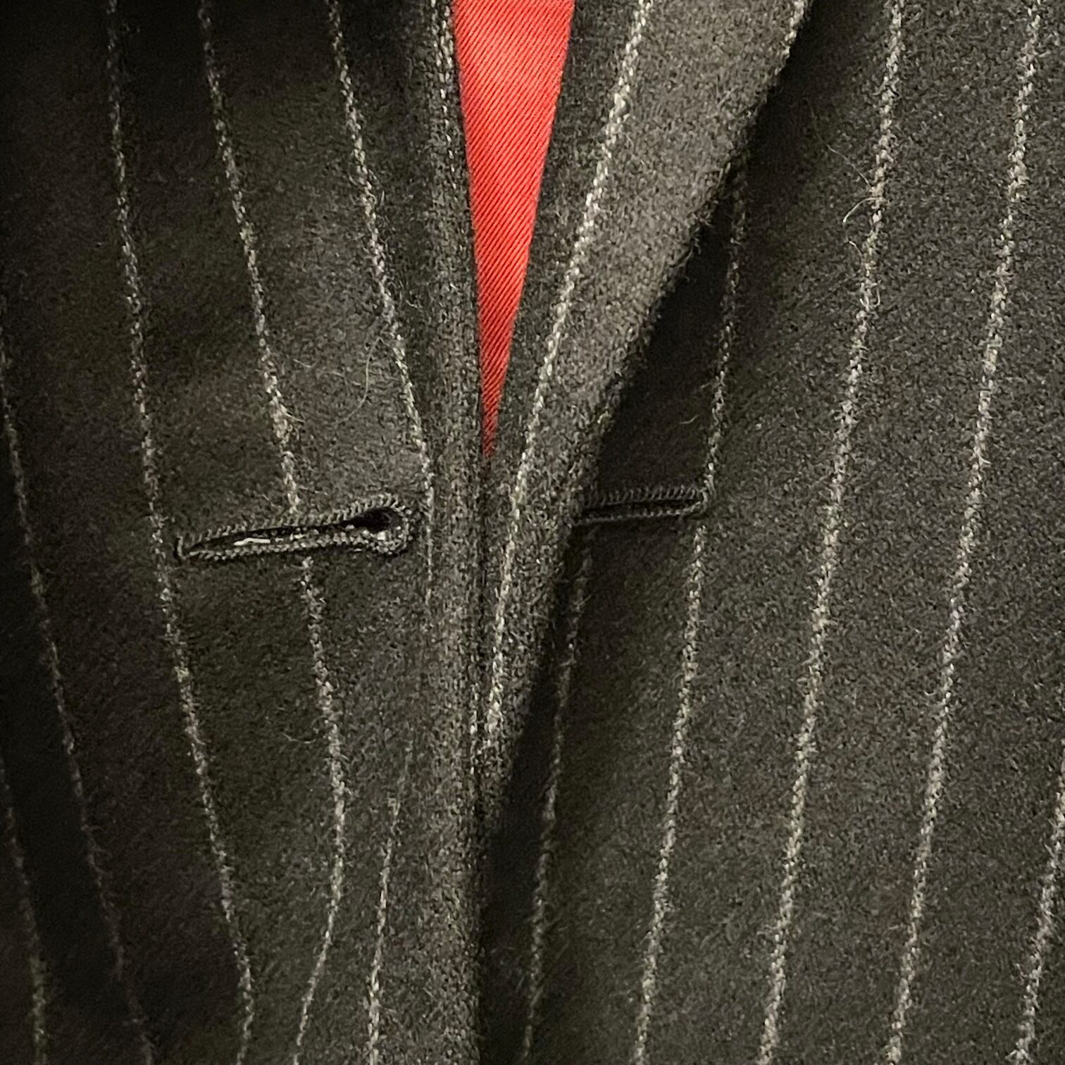 太めのストライプ柄に赤の裏地を使ったドレスコードに相応しいオシャレなデザインとなっております。