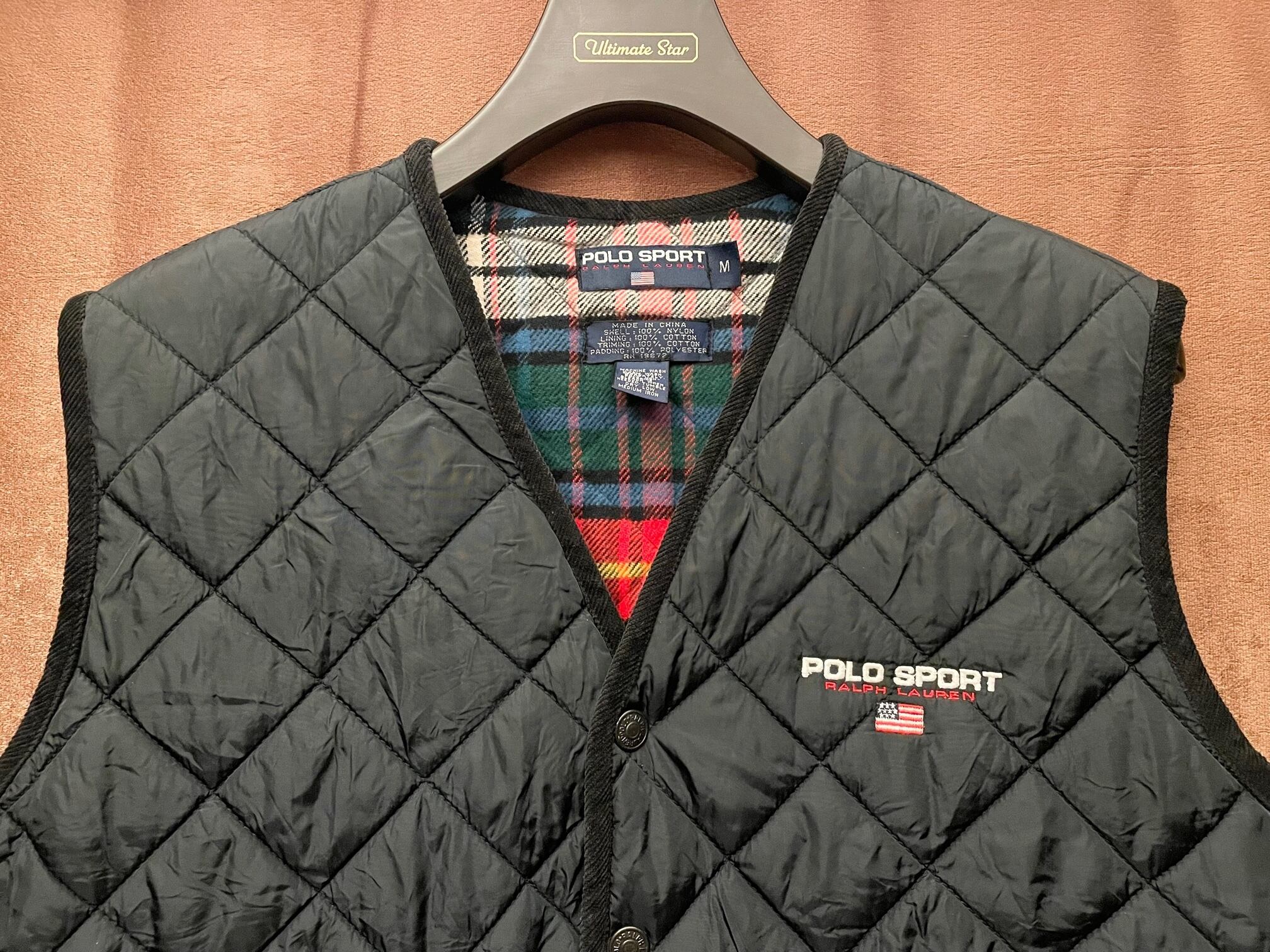 90s POLO SPORT 裏チェック柄キルティングベスト ブラック Mサイズ