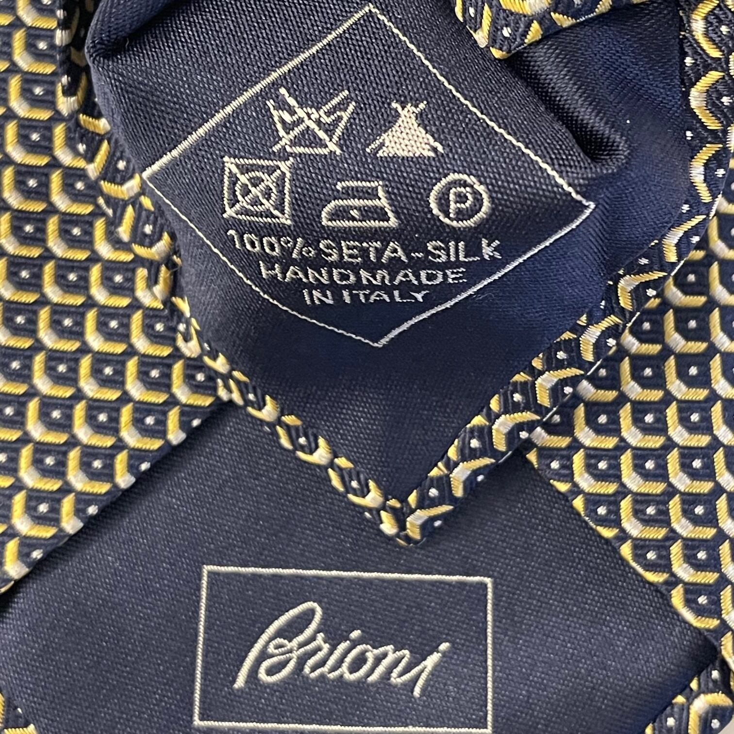 MADE IN ITALY製 Brioni HANDMADE ジャガード織り総柄シルクネクタイ ネイビー×イエロー