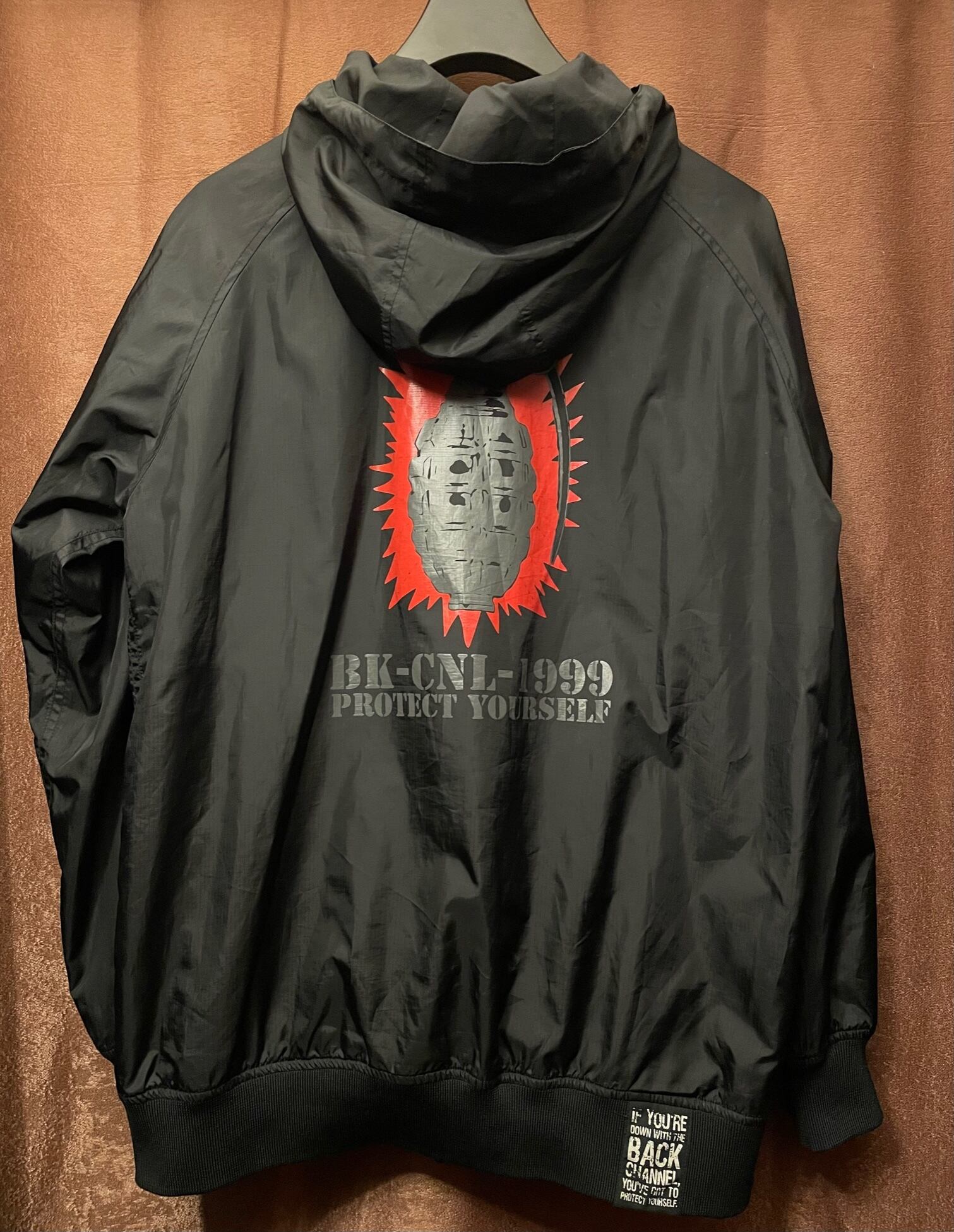 パーカーのようにフードが付いており、バックに手榴弾をモチーフにしたデザインが大きくプリントされたストリート感溢れるおすすめの一品です。