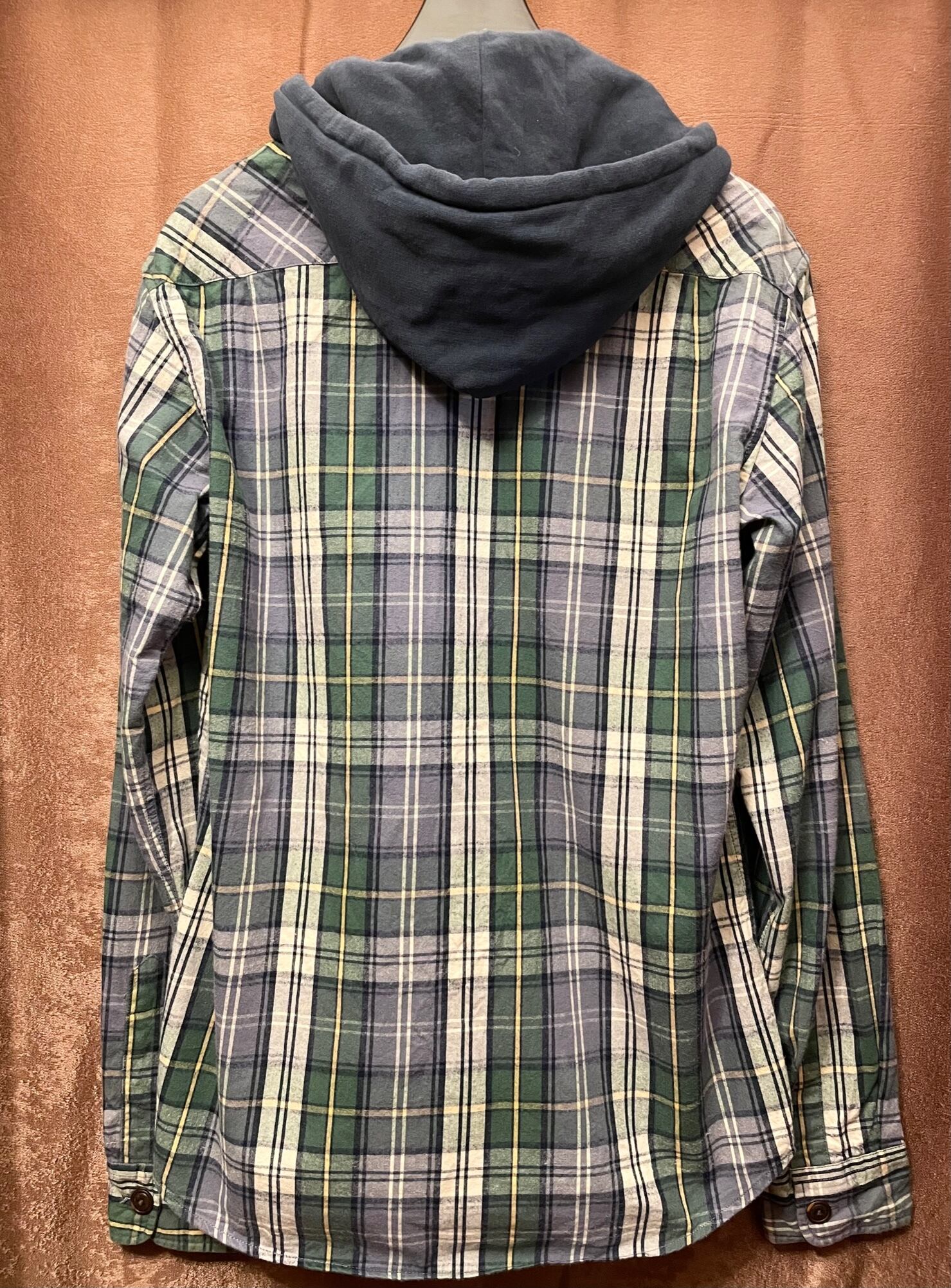 オシャレなグリーン系のチェック柄にネイビーのスウェット素材のフードを付けた珍しいデザインで、フード紐にレザーのアクセントを付けたり細部までこだわったおすすめの一品です。