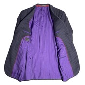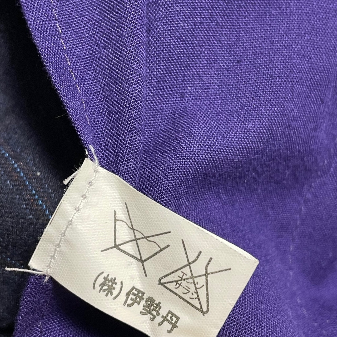 起毛感のあるしっかりとした生地はよく見ると水色とオレンジのシャドーストライプになっており、裏地に高級感のあるパープルを用いるなどラグジュアリー感溢れるおすすめの一品です。