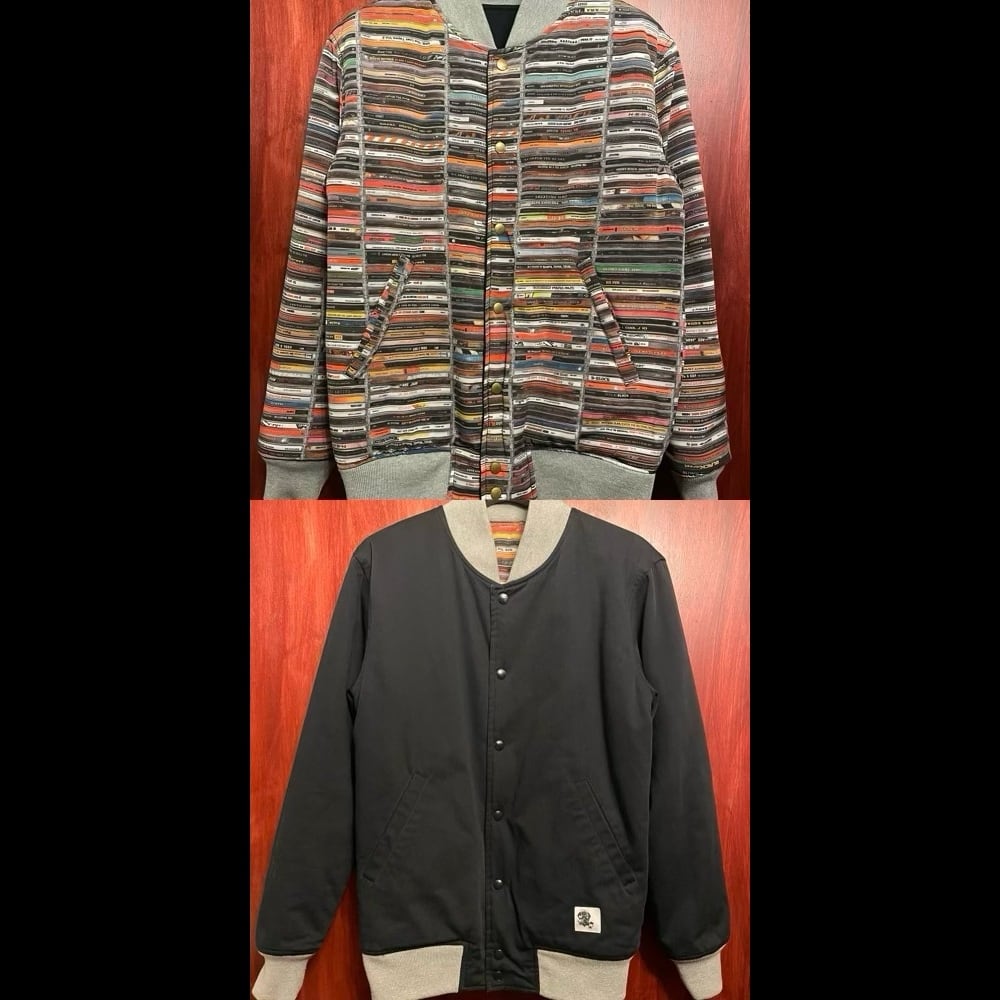 CDのジャケットを大胆にプリントした総柄のデザインとシンプルな無地のリバーシブル仕様のスタジアムジャケットで、2006年に襟リブがブラックのバージョンが発売されましたが、こちらはその前の2005年に発売された初期モデルで発売当時即完売したフェノメノンを代表する名作アイテムです。